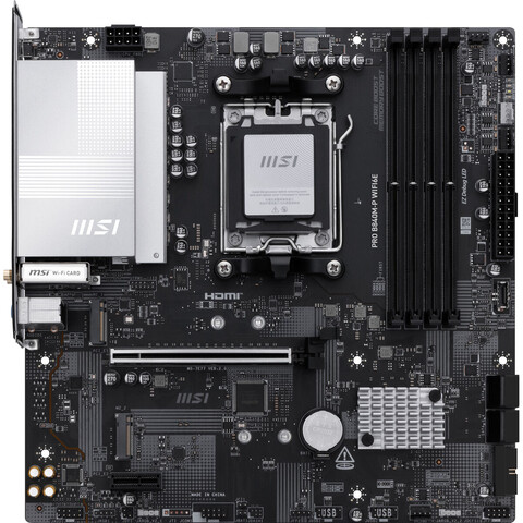 MSI PRO B840M-P WIFI6E-ը մայրական սալիկ է, որը նախատեսված է բարձր արտադրողականության համակարգերի համար, հագեցած է ամենաժամանակակից AMD AM5 չիպսեթով, համատեղելի է նոր սերնդի AMD պրոցեսորների հետ, որոնք ապահովում են օպտիմալ մշակման հզորություն պահանջկոտ առաջադրանքների և առաջադեմ կարգավորումների համար։ Դրա AM5 միակցիչը առաջարկում է լայն համատեղելիություն ամենաժամանակակից պրոցեսորների հետ, հնարավորություն տալով երկարաժամկետ թարմացումներ և բարելավումներ։ Այս մայրական սալիկն ունի MicroATX ձևի գործոն, որը համատեղում է կոմպակտ չափը ամուր դիզայնի հետ, իդեալական է տարածքի արդյունավետություն պահանջող դեպքերի համար՝ առանց կատարողականությունը զոհաբերելու։ Այն առանձնանում է իր ներկառուցված Wi-Fi 6E աջակցության շնորհիվ առաջադեմ անլար կապով, որը համատեղելի ցանցերում ապահովում է ավելի բարձր արագություններ և ավելի ցածր լատենտություն, ինչպես նաև Bluetooth ֆունկցիոնալություն՝ հեշտ ծայրամասային միացումների համար: Ֆիզիկական միացքների շարքում այն ներառում է HDMI միացք, որը հնարավորություն է տալիս ստանալ բարձր թույլտվության տեսանյութ, որը հարմար է մոնիտորների կամ արտաքին էկրանների համար՝ առանց լրացուցիչ սարքավորումների: Դրա սև դիզայնը ապահովում է նրբագեղ, պրոֆեսիոնալ տեսք, համատեղելի է Windows-ի նման տարածված համակարգչային օպերացիոն համակարգերի հետ: Այս մայրական սալիկները բազմակողմանի և հավասարակշռված լուծում են, որոնք ուղղված են կայուն, ժամանակակից հարթակ փնտրող օգտատերերին, որոնք համատեղում են տեխնոլոգիական նորարարությունը MSI-ի հուսալիության հետ: Ընդհանուր առմամբ, PRO B840M-P WIFI6E-ը հուսալի, ժամանակակից ընտրություն է սեղանադիր համակարգիչներ կառուցելու կամ արդիականացնելու համար, որոնք կենտրոնացած են առաջադեմ կապի և հավասարակշռված աշխատանքի վրա: