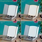 Բնօրինակ ծալովի LED հայելի՝ դիմահարդարման կազմակերպիչով (բազմաֆունկցիոնալ 3-ը 1-ում), իդեալական է դիմահարդարումը հարմարավետորեն և օպտիմալ տեսանելիությամբ քսելու համար: Այն ունի ժամանակակից, ծալովի դիզայն՝ դիմահարդարման գործիքների և ապրանքների համար մի քանի պահեստային բաժանմունքներով, այն օգնում է ձեզ խնայել տարածք և միշտ ձեռքի տակ ունենալ այն, ինչ ձեզ անհրաժեշտ է, որպեսզի կարողանաք հեշտությամբ քսել ձեր դիմահարդարումը: Բացի այդ, այն շատ բազմակողմանի և հարմարվողական է, այն աշխատում է USB-ի միջոցով (ներառում է USB-ից միկրո USB մալուխ) կամ կարող է աշխատել մարտկոցով (չի մատակարարվում), կախված նրանից, թե ինչ եք նախընտրում ցանկացած պահի: Այն ունի LED լույս՝ սենսորային կառավարմամբ և լուսավորության 3 ռեժիմով (սառը լույս, տաք լույս, ցերեկային լույս): Այս համայնապատկերային և շարժական սեղանի վրա տեղադրվող հայելին ունի կենտրոնական հայելի և երկու կողային հայելիներ, որոնք հեշտությամբ կարող են ծալվել և բացվել: Այն ներառում է հետևի մասում մինի սահող հայելի՝ x7 մեծացմամբ՝ ձեր ցանկալի դեմքի հատվածը մեծացնելու համար, ինչպես նաև ունի փոքր, չսահող ոտքեր՝ ամուր ամրացնելու համար։