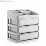 Այս գործնական, փոխադրելի կոսմետիկայի կազմակերպիչը հնարավորություն է տալիս հարմարավետորեն հասանելիություն ունենալ դիմահարդարման և խնամքի համար անհրաժեշտ ամեն ինչին՝ զբաղեցնելով նվազագույն տարածք: Այն ունի 3 դարակ և վերևում հանվող սկուտեղ՝ տարբեր չափերի 9 բաժանմունքներով: