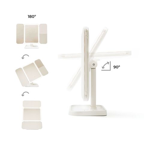 - Բազմադիրք, կարգավորվող թեքություն և պտույտ. այս բազմակողմանի եռակի ծալովի սեղանի հայելին լույսով հարմարվում է օգտագործողի նախասիրություններին մինչև 90º թեքությամբ և 180º պտույտով: