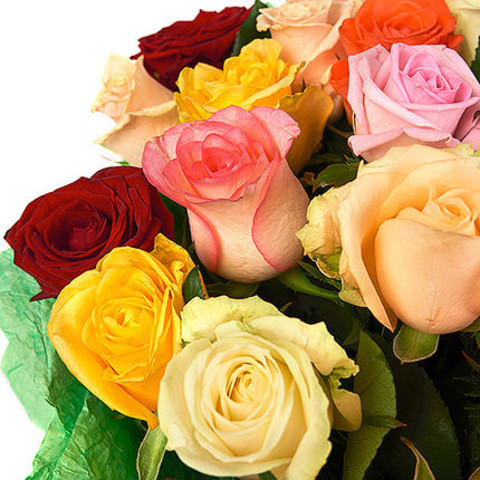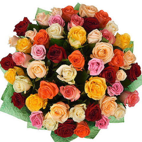 Բազմերանգ վարդերի գլխապտույտ խառնուրդ՝ ստացողը ուղղակի կապշի: Նման ծաղկեփունջը երկար ժամանակ կմնա հիշողության մեջ: