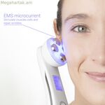 Էրգոնոմիկ և բազմաֆունկցիոնալ դեմքի մերսիչ՝ ռադիոհաճախականությամբ, լուսաթերապիայով և էլեկտրոստիմուլյացիայով, որը բարելավում է մաշկի վիճակը և տեսքը՝ հասնելով հզոր բուժիչ և երիտասարդացնող ազդեցության մաշկի վրա: Դրա առաջադեմ եռակի թերապիան ապահովում է արդյունավետ արդյունք առաջին իսկ կիրառումից: Իր բազմաթիվ առավելությունների շնորհիվ այս ժամանակակից, հակատարիքային մերսիչը կատարյալ է ձեր դեմքի խնամքի համար, քանի որ այն ապահովում է ավելի երիտասարդ և փայլուն մաշկ՝ ավելի մեծ առաձգականությամբ, ամրությամբ, պայծառությամբ և հավասարությամբ: Իդեալական է մաշկի վերականգնմանը նպաստելու և կնճիռների, արտահայտման գծերի, պզուկների, ծակոտիների, սև կետերի, կարմրության, պեպենների, բծերի և այլնի կանխարգելման կամ դեմ պայքարի համար: Լուսաթերապիայի բուժումը թույլ է տալիս ընտրել 6 LED լույսի կարգավորումներից մեկը՝ տարբեր գործառույթներով և մաշկի վրա ազդեցությամբ, ինչպես նշված է ներառված ձեռնարկում (կարմիր, կանաչ, կապույտ, դեղին, վարդագույն, թարթող վարդագույն): Ռադիոհաճախականությունը և էլեկտրաստիմուլյացիան (RF/ESM) հասնում են մաշկի խորը շերտերին և համատեղ աշխատում են ընտրված լուսային թերապիայի հետ: Կարող եք ընտրել 5 ինտենսիվության մակարդակներից մեկը: Մերսող սարքն ունի թեթև դիզայն, լիցքավորվող է և փոխադրելի, հետևաբար այն հեշտ և հարմար է օգտագործելու, տեղափոխելու և պահելու համար: Այն ունի LCD էկրան և ավտոմատ կերպով անջատվում է: Սարքն օգտագործվում է մաշկի մշակվող հատվածի վրա թեթև սեղմելով և նուրբ շրջանաձև շարժումներ կատարելով: Լավագույն արդյունքի հասնելու համար օգտագործելուց առաջ մաքրեք դեմքը և քսեք ձեր սովորական կրեմը/շիճուկը՝ դրա ազդեցությունը ուժեղացնելու համար: Խորհուրդ է տրվում օրական առավելագույնը 10 րոպե օգտագործել: Ներառում է լիցքավորման հիմք և DC-USB մալուխ։