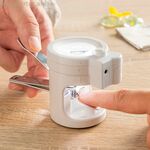 - Սպիտակ LED լույս. այս լույսով և խոշորացույցով կտրիչները ունեն 4 LED լույս՝ եղունգները կտրելիս տեսանելիությունը բարելավելու համար։ Միացման/անջատման կոճակը անհրաժեշտության դեպքում միացնում և անջատում է լույսը՝ կախված շրջապատի լույսից։ Այն աշխատում է մարտկոցներով (3 x LR44, ներառված է) կամ USB միացմամբ (ներառյալ USB-ի մալուխ):