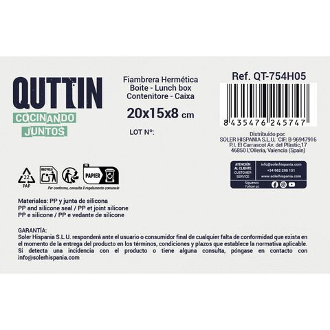 Հերմետիկ փակվող ճաշի տուփ Quttin L&F ուղղանկյուն 20 x 15 x 8 սմ (12 հատ) լավագույն գնով։