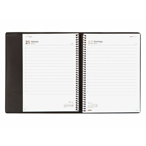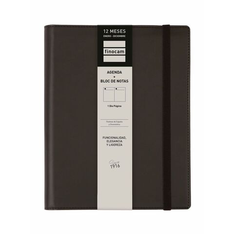Finocam-ի DUOBAND պլանավորիչը պարուրաձև պլանավորիչ է, որը համատեղում է ֆունկցիոնալությունը և նրբագեղ դիզայնը՝ շարժական և սեղանադիր ձևաչափով, որը նման է A5-ին (մոտավորապես 15.5 x 21.2 սմ): Դրա կազմը պատրաստված է սև սինթետիկ կաշվից, ապահովելով էլեգանտ ձևավորում և հարմար ամրություն ամենօրյա օգտագործման համար, մինչդեռ էջերը պատրաստված են 70 գրամ FSC քլոր չպարունակող թղթից, ապահովելով գրելու և նշումներ կատարելու օպտիմալ որակ: Այս պլանավորիչն ունի առաձգական ժապավենով փակվող ժապավեն, որը ամեն ինչ պահում է անվտանգ, ինչպես նաև ներքին գրպան՝ փաստաթղթեր կամ լրացուցիչ նշումներ պահելու համար: Դրա պարուրաձև կազմը թույլ է տալիս լիարժեք բացել և արագ մուտք գործել միկրո-անցքերով անկյունների միջոցով, որոնք նշում են ընթացիկ օրը կամ շաբաթը: Տարեկան բովանդակությունը ներառում է օգտակար տեղեկատվություն, ինչպիսիք են անվանական օրերը և ազգային տոները, դասավորված 12-ամսյա օրացույցով (հունվարից դեկտեմբեր)՝ մեկ օր մեկ էջում ձևաչափով, ինչը հեշտացնում է մանրամասն և հստակ կազմակերպումը: Բացի այդ, այն գալիս է առանձին տետրով, որը միշտ տրամադրում է դատարկ թերթեր, իդեալական է արագ նշումների համար և նաև հասանելի է որպես լրացում, բարելավելով դրա ֆունկցիոնալությունը և կյանքի տևողությունը: Կազմը փոխարինելի է, ինչը թույլ է տալիս պահպանել այն և թարմացնել միայն պարուրաձև ներքին մասը ամեն տարի, նույնիսկ վերօգտագործել այն որպես այլ գրքերի կամ տետրերի կազմ: Ամբողջ արտադրանքը նախատեսված է այն օգտատերերի համար, ովքեր կարիք ունեն գործնական, դիմացկուն և գեղագիտականորեն նուրբ պլանավորողի մասնագիտական կամ անձնական օգտագործման համար՝ Finocam-ին բնորոշ բազմակողմանիությամբ և ոճով: Ընդհանուր առմամբ, DUOBAND պլանավորիչը ներկայացնում է նրբագեղության, հարմարավետության և օգտակարության հավասարակշռված լուծում՝ ամենօրյա ժամանակի և առաջադրանքների կառավարման համար։