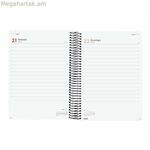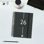 Finocam YEAR պլանավորիչը նախատեսված է անձնական և մասնագիտական կազմակերպումը օպտիմալացնելու համար՝ համատեղելով ֆունկցիոնալությունն ու գործնականությունը կառավարելի և դիմացկուն ձևաչափով: Այն մոտավորապես 15.5 x 21.2 սմ չափսերով է, որը համարժեք է DIN A5 չափսին, ինչը հեշտացնում է այն տեղափոխելն ու օգտագործելը՝ թե՛ սեղանին, թե՛ ճանապարհին: Դրա կազմերը պատրաստված են սև պոլիպրոպիլենից, որը թեթև և դիմացկուն նյութ է, որը պաշտպանում է ինտերիերը, մինչդեռ դրա պարուրաձև կապը հնարավորություն է տալիս հարմարավետ, հարթ բացվել: Այն նաև ունի առաձգական ժապավենի փակման համակարգ, որը ամրացնում է պարունակությունը և կանխում պատահական բացումները: Ներսում էջերը պատրաստված են 80 գրամանոց FSC հավաստագրված քլոր չպարունակող թղթից, որը ապահովում է էկոլոգիապես մաքուր, բարձրորակ մակերես՝ պարզ, անարյուն գրելու համար: Պլանավորիչը ներառում է 12-ամսյա տարեկան օրացույց (հունվարից դեկտեմբեր)՝ հորիզոնական շաբաթվա տեսքի դասավորությամբ և միկրո-անցքավոր անկյուններով՝ ընթացիկ օրվա կամ շաբաթվա արագ գտնվելու վայրը որոշելու համար: Դրա բովանդակությունը հարստացված է օգտատիրոջ համար լրացուցիչ օգտակար տեղեկատվությամբ, ներառյալ անվանակոչման օրերը, ազգային և միջազգային տոները, սեզոնային փոփոխությունները և տարբեր տարիների մեկնարկի ամսաթվերը՝ ըստ չինական, մուսուլմանական, ուղղափառ և հրեական օրացույցների: Այն նաև պարունակում է անձնական տվյալների, ժամանակացույցերի, ընթացիկ և հաջորդ տարվա տարեկան պլանավորման, ինչպես նաև Եվրոպայի և ժամային գոտիների քարտեզների բաժիններ, որոնք լրացվում են գործնական խորհուրդներով, ինչպիսիք են՝ ինչպես որոնել Google-ում և ստեղնաշարի հիմնական դյուրանցումները: Ֆունկցիոնալ դիզայնի և լայնածավալ բովանդակության համադրությունը այն դարձնում է բազմակողմանի ընտրություն մասնագետների կամ անհատների համար, ովքեր կարիք ունեն հուսալի, լավ կառուցվածքային գործիքի՝ ամենօրյա գործունեությունը կառավարելու համար: Այս Finocam YEAR պլանավորողը առանձնանում է գործնականության, թարմացված բովանդակության և նյութի որակի իր հավասարակշռությամբ՝ ծառայելով որպես արդյունավետ գործիք մանրամասն և մատչելի տարեկան պլանավորման համար։