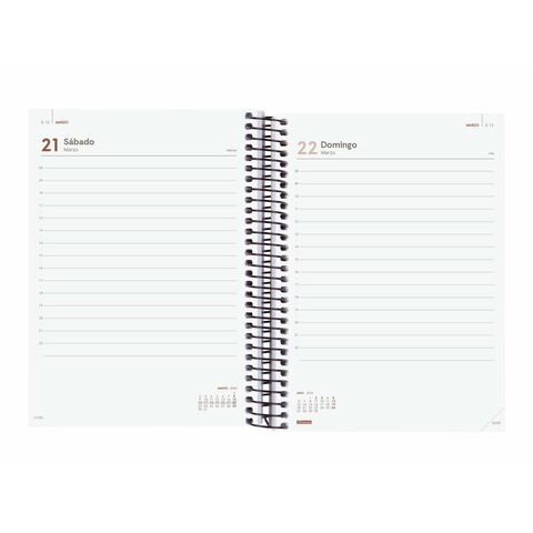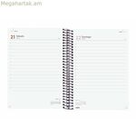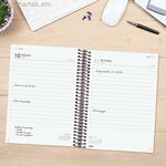 Finocam պարուրաձև պլանավորիչը նախատեսված է ինչպես մասնագիտական, այնպես էլ անձնական կազմակերպչական նպատակների համար, առանձնանում է կոմպակտ DIN A5-անման ֆորմատով՝ մոտավորապես 15.5 x 21.2 սմ չափսերով, համատեղելով փոխադրելիությունը սեղանի պլանավորիչի հարմարավետության հետ: Դրա կազմը պատրաստված է մոխրագույն պոլիպրոպիլենից, որը թեթև և դիմացկուն նյութ է, որը թույլ է տալիս անհատականացնել այն՝ տեղադրելով նկարներ, լուսանկարներ կամ ցանկացած համապատասխան փաստաթուղթ, կամ ներբեռնելով նախապես նախագծված կազմերը Finocam-ի կայքից: Այս առանձնահատկությունը իդեալական է պլանավորիչը կորպորատիվ ինքնությանը հարմարեցնելու համար, ինչպես նաև թույլ է տալիս ներառել ընկերության լոգո կամ պատկեր մասնագիտական օգտագործման համար: Սպիրալաձև կազմը հեշտացնում է կառավարումը և էջի ամբողջական բացումը, մինչդեռ էլեգանտ առաձգական ժապավենի փակումը ամրացնում է պլանավորիչը և պաշտպանում դրա բովանդակությունը: Էջերն ունեն միկրո-անցքավոր անկյուններ՝ ընթացիկ օրը կամ շաբաթը ուղղահայաց շաբաթական դասավորության մեջ արագ գտնելու համար՝ ապահովելով հստակ և ֆունկցիոնալ պլանավորում: Բացի այդ, ներքին մասը պատրաստված է 80 գրամանոց FSC հավաստագրված քլոր չպարունակող թղթից՝ ապահովելով որակ և շրջակա միջավայրի խնամք: Պլանավորիչը ներառում է ամբողջական 12-ամսյա տարեկան օրացույց (հունվար-դեկտեմբեր) և պարունակում է համապատասխան օգտատիրոջ տեղեկատվություն՝ ինչպես նաև լրացուցիչ բովանդակություն, որը լրացնում է ամենօրյա օգտագործումը: Դրա ժամանակակից և ֆունկցիոնալ դիզայնը բավարարում է առաջադրանքներն ու հանդիպումները պլանավորելու հիմնական, բայց ճկուն գործիքի անհրաժեշտությունը, հատկապես ընդգծելով դրա անհատականացման տարբերակները և չափը, որը հարմար է պայուսակում կամ մեջքի պայուսակում կրելու համար՝ առանց զոհաբերելու հարմարավետ գրելը: Ընդհանուր առմամբ, Finocam-ի պլանավորիչը բազմակողմանի և գործնական ընտրություն է, որը համատեղում է որակյալ նյութերը, օգտագործման հեշտությունը և ժամանակի արդյունավետ կառավարման համար հարմարեցվող տարբերակները։