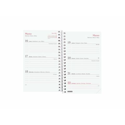 Finocam-ի DESIGN COLLECTION Ahora պլանավորիչը գործնական, կոմպակտ արտադրանք է, որը նախատեսված է ամենօրյա անձնական և մասնագիտական կազմակերպումը պարզեցնելու համար: Այն ունի մինի ձևաչափ՝ մոտավորապես 7.9 x 12.7 սմ չափսերով, ինչը այն դարձնում է թեթև և հեշտ ձեզ հետ տանելու համար: Դրա կազմերը պատրաստված են պոլիպրոպիլենից, որը դիմացկուն և թեթև նյութ է, որը պաշտպանում է ինտերիերը, մինչդեռ էջերը պատրաստված են 80 գրամ FSC քլոր չպարունակող թղթից, ինչը ապահովում է որակյալ գրելու աջակցություն: Կազմը պարուրաձև է, որը թույլ է տալիս լիարժեք և հարմարավետ բացել, և այն ներառում է գործնական առաձգական ժապավենով փակում, որը պլանավորիչը փակ է պահում և պաշտպանում է դրա պարունակությունը: Ներքին դիզայնը մաքուր և ֆունկցիոնալ է՝ շաբաթական հորիզոնական դասավորությամբ, որը ապահովում է շաբաթական պարտավորությունների հստակ տեսանելիություն և բավարար տարածք նախագծերն ու առաջադրանքները գրանցելու համար: Այս պլանավորողը ներառում է 12-ամսյա օրացույց (հունվարից դեկտեմբեր), որը լրացվում է համապատասխան տարեկան տեղեկատվությամբ, ինչպիսիք են անվանակոչման օրերը, ազգային տոները, սեզոնային փոփոխությունների և չինական, մուսուլմանական, ուղղափառ և եբրայական նոր տարիների սկզբի մանրամասները՝ առաջարկելով գլոբալ մշակութային հեռանկար: Այն նաև պարունակում է լրացուցիչ անձնական կազմակերպչական բովանդակություն, ինչպիսիք են անձնական տվյալները և այլ օգտակար տարրեր համապարփակ և արդյունավետ պլանավորման համար: Արտադրված է Չինաստանում՝ ժամանակակից, նորաձև դիզայնով՝ Finocam ապրանքանիշի երաշխիքով: Դրա մինի ձևաչափը և միկրո-անցքավոր անկյունները թույլ են տալիս արագ մուտք գործել ընթացիկ շաբաթ կամ օր՝ օպտիմալացնելով օգտագործողի փորձը: Պլանավորողի լեզուն իսպաներենն է, որը հարմարեցված է իսպանախոս շուկայի համար: Ընդհանուր առմամբ, այս օրացույցը առանձնանում է ֆունկցիոնալության, կոմպակտ չափսերի և որակյալ նյութերի իր հավասարակշռությամբ, ինչը այն դարձնում է գործնական լուծում նրանց համար, ովքեր փնտրում են լավ կազմակերպված, կոմպակտ գործիք իրենց ժամանակը և առօրյա գործունեությունը կառավարելու համար։