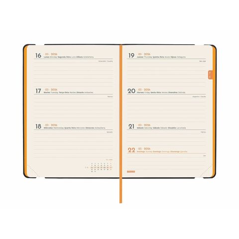 Finocam-ի FLEXI պլանավորիչը գործնական և կոմպակտ պլանավորիչ է, որը նախատեսված է 2026 թվականի համար, համատեղելով ֆունկցիոնալությունն ու հարմարավետությունը հեշտ տեղափոխման ձևաչափում: Այն ունի ճկուն պոլիուրեթանային ծածկույթով փափուկ կազմ և փափուկ հպման արտաքին նյութ, ապահովելով հարմարավետություն ամենօրյա օգտագործման համար: Դրա մոտավոր չափսերը 11.8 x 16.8 սմ և թղթի քաշը 80 գ/մ² ապահովում են ամուր, ամուր էջեր, որոնք տպագրվում են 12 ամսվա (հունվարից դեկտեմբեր) լրիվ տարեկան օրացույցով իսպաներենով, օրական մեկ էջ՝ մանրամասն պլանավորման համար: Պլանավորիչը ներառում է ֆունկցիոնալ մանրամասներ, ինչպիսիք են՝ միկրո-անցքավոր անկյունները, որոնք թույլ են տալիս արագ մուտք գործել ընթացիկ շաբաթ կամ օր, գումարած վերևի ցուցիչ՝ ընթացիկ ամսվան հեշտությամբ ծանոթանալու համար: Դրա առաձգական ժապավենի փակումը պահպանում է բովանդակությունը պաշտպանված և կազմակերպված տեղափոխման ընթացքում, մինչդեռ ժապավենային նշիչը օգնում է նշել ակտիվ էջը արագ խորհրդատվության համար: Այն կազմված է FSC քլոր չպարունակող թղթով, որը կարևոր առանձնահատկություն է շրջակա միջավայրի նկատմամբ գիտակից օգտատերերի համար: Լրացուցիչ բովանդակությունը ներառում է անձնական տվյալներ, տարեկան պլանավորում սյունակներում, ժամանակացույցեր, անվանական օրերի և ազգային տոների վերաբերյալ տեղեկատվություն, որոնք բոլորը ներկայացված են հստակ և ֆունկցիոնալ դասավորությամբ: Այս պլանավորիչը հատկապես հարմար է նրանց համար, ովքեր փնտրում են մանրամասն կազմակերպվածություն՝ պարզ, բայց նուրբ դիզայնով, իդեալական է մասնագետների, ուսանողների կամ արդյունավետ և փոխադրելի պլանավորման համակարգի կարիք ունեցող յուրաքանչյուրի համար: Ամփոփելով՝ Finocam-ի FLEXI պլանավորիչը առաջարկում է գործնականության, որակի և դիզայնի օպտիմալ հավասարակշռություն՝ հարմարեցված ժամանակի կառավարման ամենօրյա կարիքներին։