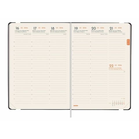 Finocam-ի FLEXI պլանավորիչը գործնական և ֆունկցիոնալ պլանավորիչ էA5 ֆորմատի (14.8 x 21 սմ), որը նախատեսված է 2026 թվականի համար: Այն ունի փափուկ կազմ, որը պատրաստված է փափուկ հպման նյութից, որը հաճելի է հպման համար, պատված է ճկուն պոլիմերով՝ ամրության և թեթևության համար: Դրա ներքին մասը պատրաստված է 80 գրամ քլոր չպարունակող FSC հավաստագրված թղթից, որը իդեալական է ամենօրյա գրելու համար: Պլանավորողն առաջարկում է շաբաթվա ուղղահայաց տեսքի դասավորություն, որը թույլ է տալիս հեշտությամբ դիտել տարվա օրերն ու շաբաթները, ներառյալ ամսական և տարեկան օրացույց՝ համապատասխան տեղեկատվությամբ, ինչպիսիք են տոները և անվանական օրերը իսպաներենով: Կազմակերպչականությունը հեշտացնելու համար այն ներառում է ցանցային էջեր ամսական պլանավորման, առաջադրանքների և կարևոր ամսաթվերի համար, ինչպես նաև անձնական տվյալների և տարեկան պլանավորման բաժիններ սյուներով: Բացի այդ, այն ունի փակման ռետինե ժապավեն և ժապավենային էջանիշ՝ պլանավորողը փակ պահելու և ընթացիկ էջը արագ գտնելու համար, ինչպես նաև միկրո-անցքավոր անկյուններ՝ ամենօրյա օգտագործման հեշտության համար: Դիզայնը նաև ներառում է տպագրություն էջի եզրերի շուրջ և վերին ցուցիչ՝ յուրաքանչյուր ամիսը նույնականացնելու համար, ինչը բարելավում է պլանավորողում նավարկությունը: Ամփոփելով՝ Finocam FLEXI-ը բազմակողմանի և ֆունկցիոնալ ընտրություն է նրանց համար, ովքեր փնտրում են կոմպակտ և ամբողջական պլանավորող՝ 2026 թվականին ժամանակի արդյունավետ կառավարման համար։