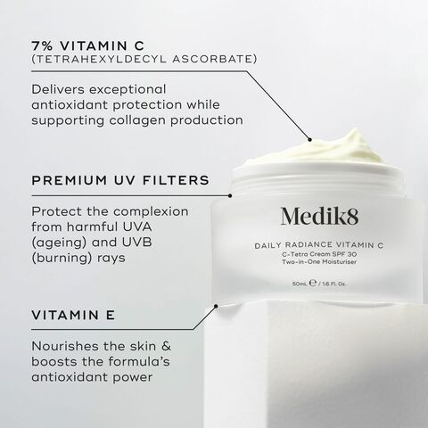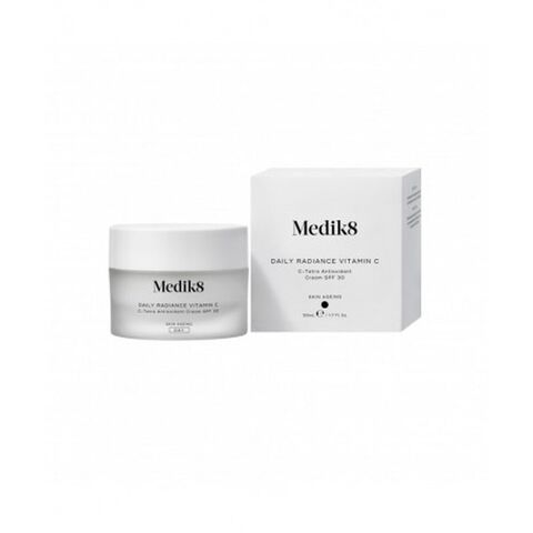Medik8 Daily Radiance Vitamin C-ի ցերեկային կրեմը խոնավեցնող դեմքի կրեմ է՝ SPF 30-ով, որը մշակվել է որպես «բոլորը մեկում» ամենօրյա խնամք՝ բոլոր տեսակի մաշկի համար պաշտպանություն և փայլ ապահովելու համար՝ և՛ տղամարդկանց, և՛ կանանց համար: Թեթև, արագ ներծծվող հյուսվածքով այն համատեղում է լայն սպեկտրի SPF 30 ֆիլտրերը հակաօքսիդանտային համալիրի հետ, որը պարունակում է կայունացված վիտամին C (տետրահեքսիլդեցիլ ասկորբատ) և վիտամին E (տոկոֆերիլ ացետատ), որոնք օգնում են պաշտպանվել ազատ ռադիկալներից և բարելավել մաշկի գունատ երանգը և ծերացման առաջին նշանները: Դրա խոնավեցնող ազդեցությունը ամրապնդվում է գլիցերինով և հիալուրոնաթթվով (նատրիումի հիալուրոնատ), որոնք օգնում են պահպանել մաշկը առաձգական և հարմարավետ ամբողջ օրվա ընթացքում: Բանաձևը, գործնական 50 մլ ձևաչափով, վեգան է, առանց ալկոհոլի և պարաբենների, հարմար է ամենօրյա օգտագործման համար և նուրբ է մաշկի մեծ մասի, նույնիսկ զգայուն մաշկի համար: Այն պարունակում է եթերային յուղեր, ինչպիսիք են բերգամոտը, գրեյպֆրուտը, կիտրոնը և խորդենին, որոնք քսելուց հետո թարմության զգացողություն են հաղորդում: Արտադրված է ԱՄՆ-ում և ներկայացված է սպիտակ գույնով, այս Medik8 ցերեկային կրեմը նախատեսված է դեմքի խնամքի ռեժիմին հեշտությամբ ինտեգրվելու համար՝ որպես դիմահարդարումից առաջ վերջին քայլ կամ որպես ամենօրյա քաղաքային պաշտպանություն, մեկ արտադրանքում առաջարկելով խոնավեցում, հակաօքսիդանտային պաշտպանություն և արևի ֆիլտր։