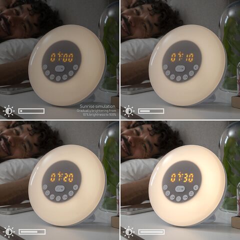 Այս արևածագի զարթուցիչը բարձրախոսով ունի տարբեր հանգստացնող ձայներ և մեղեդիներ, որպեսզի կարողանաք ընտրել զարթուցիչի տեսակը ցանկացած պահի: Դրա արևածագի լույսը կսկսի աստիճանաբար միանալ զարթուցիչի հնչյունից 30 րոպե առաջ՝ աստիճանաբար լուսավորելով սենյակը (արևածագի էֆեկտ):